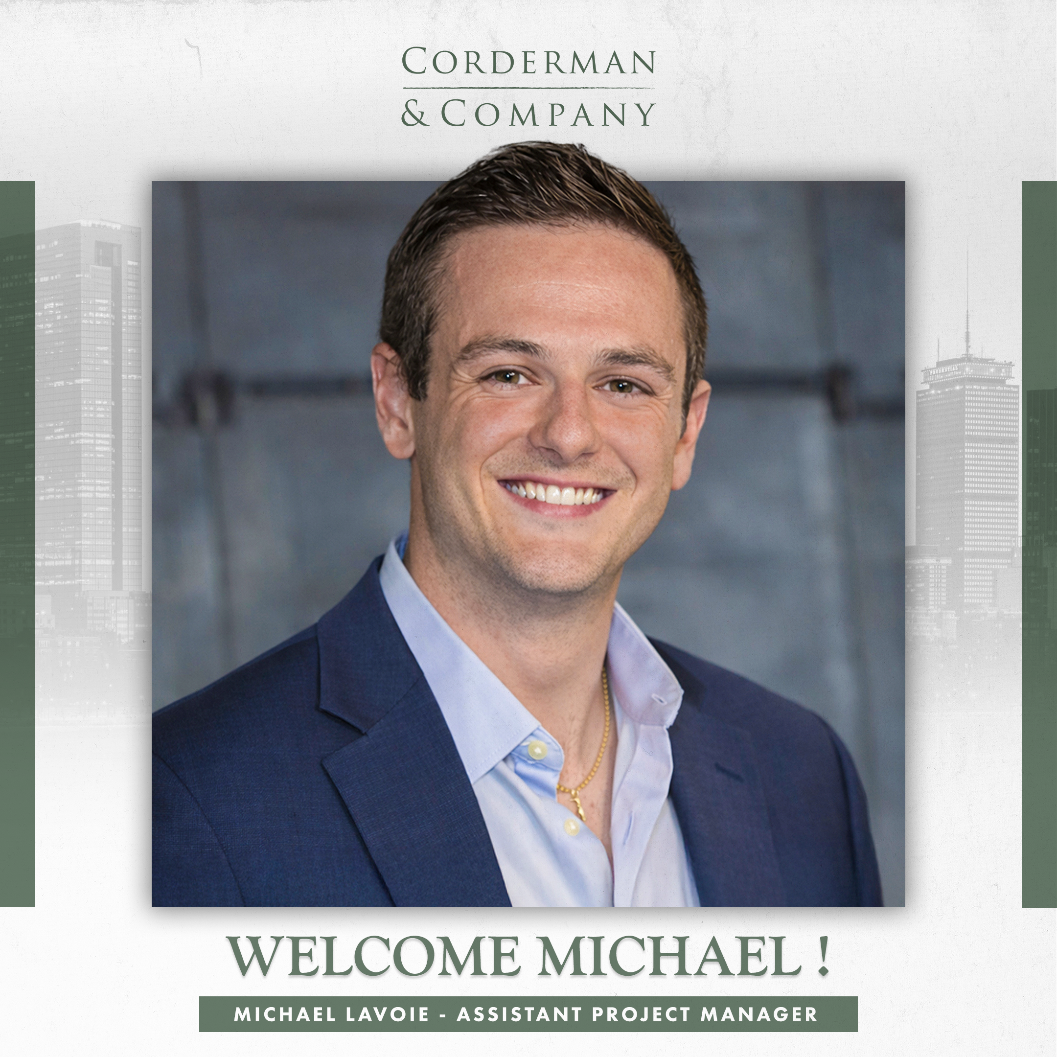 Michael has quickly jumped into the thralls of project management here at Corderman, acting as an APM on two confidential investment management firms at 200 Clarendon Street and 177 Huntington Avenue.